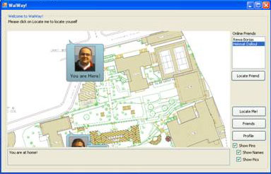 We are currently envisioning the third wave of computing named pervasive computing that enables "calm technology" where the computing facility is integrated in one’s physical environment. One of the main classes of the next generation applications in the pervasive computing era is location-aware services. Localizing or positioning people and objects is supported by various technologies, the famous of which is GPS (Global Positioning System). Other widely available technologies can as well be utilized for localization, namely Bluetooth and WiFi. These technologies are supported by almost all laptops and PDAs. In this work, we design and develop a location-based social networking service WaiWay (Where am I where are you) that makes use of WiFi positioning techniques to locate, contact, and chat with friends and other interesting people with similar interests and hobbies. The system has a friendly user interface that helps users to manage their accounts in an easy way, locate themselves and others in a fast way, and relocate themselves if they are on the move. The accuracy of the localization is within 2-3 meters.